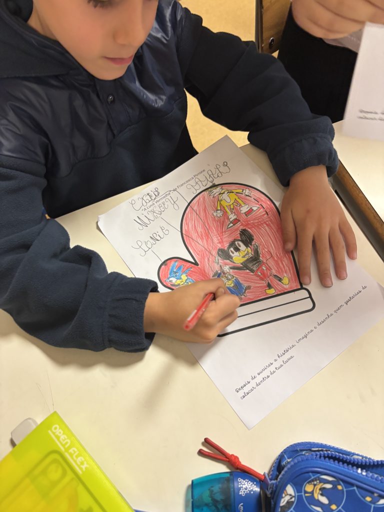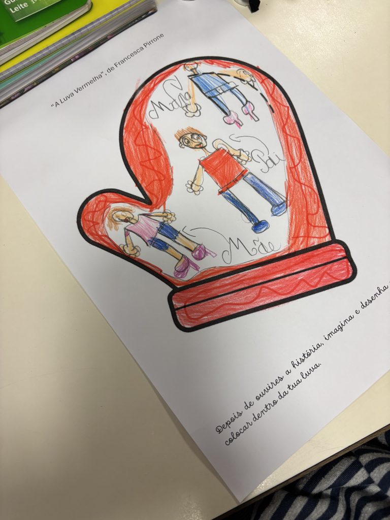Após a leitura encenada da história, foi proposto aos alunos imaginarem e desenharem quem gostariam de colocar dentro da sua luva. Esta luva é especial, pois assume o significado de proteção, de identidade e de pertença.